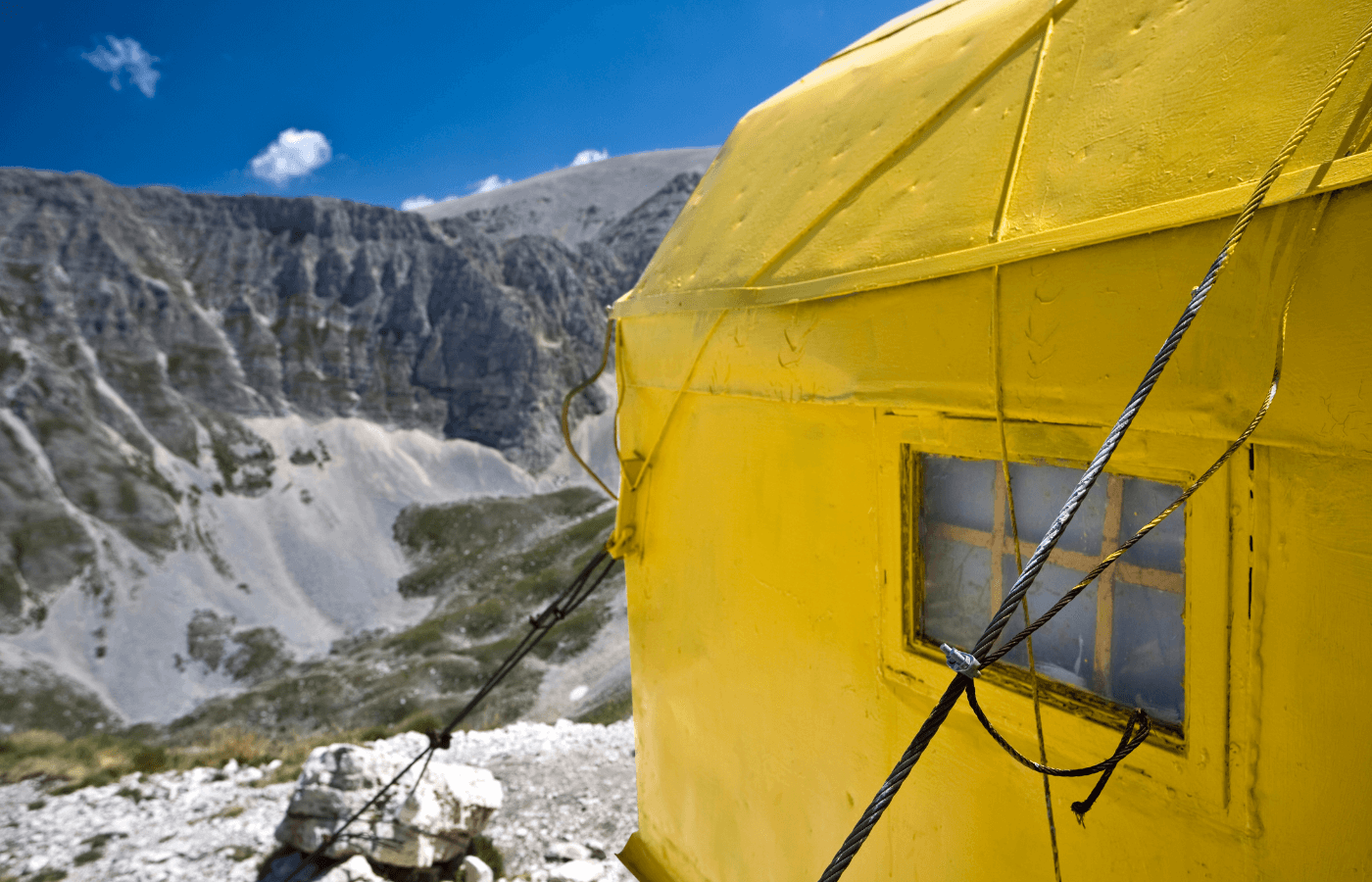 Perched on the slopes of Monte Amaro, the second-highest peak in the Apennines, Bivouac Carlo Fusco is a small but mighty shelter that rewards determined hikers with jaw-dropping views of the Murelle amphitheater. Recently renovated in 2019, the bright yellow bivouac sleeps six on simple bunk beds and includes a ventilated anteroom for storing gear or cooking, keeping the main space warm and protected.